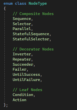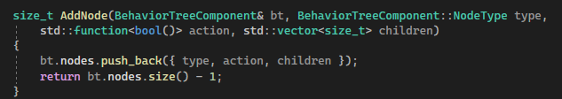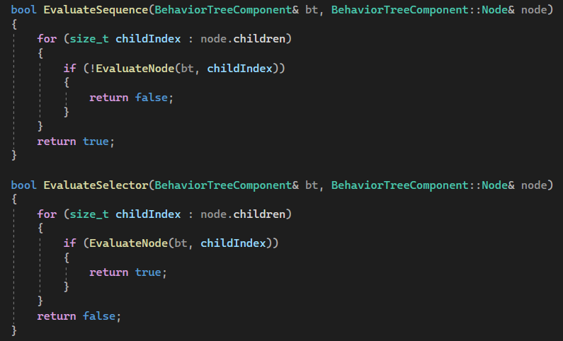 For my specialization, I chose to work on my own Behavior Tree. The reason behavior trees interest me is that they allow for easy AI setup and debugging, with every behavior simply being a node in the tree's hierarchical structure. To add a behavior, all it takes is adding a node.